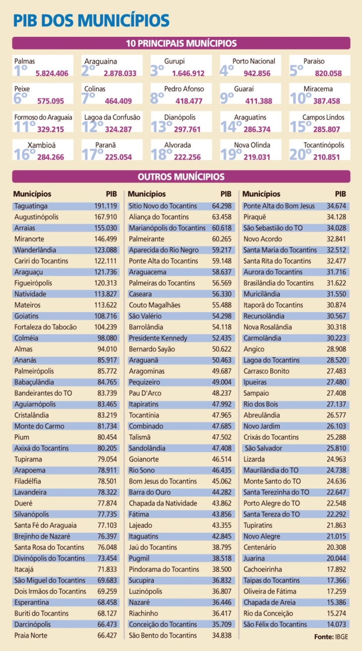 Apenas 20 dos 139 municípios tocantinenses concentram cerca da metade de toda a riqueza produzida no Tocantins, conforme dados divulgados ontem pelo Instituto Brasileiro de Geografia e Estatística (IBGE), referentes ao ano de 2013. O Produto Interno Bruno (PIB) do Tocantins, em 2013, foi de R$ 35,5 bilhões, sendo que apenas os 20 municípios foram responsáveis por R$ 17 bilhões.