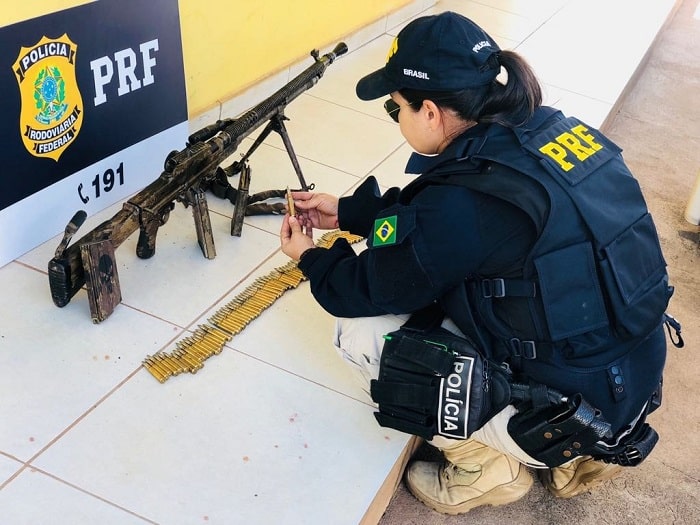 Conforme a PRF, a arma tem calibre 30 e é usada em assaltos a bancos e carros-forte. Também foram encontradas 100 munições intactas.