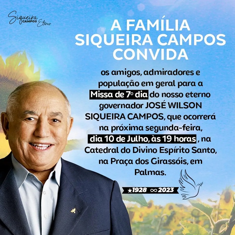 A missa de 7º dia do ex-governador Jose Wilson Siqueira Campos será realizada nesta segunda-feira (10) de julho na Catedral do Divino Espírito Santo, na Praça dos Girassóis, em Palmas.