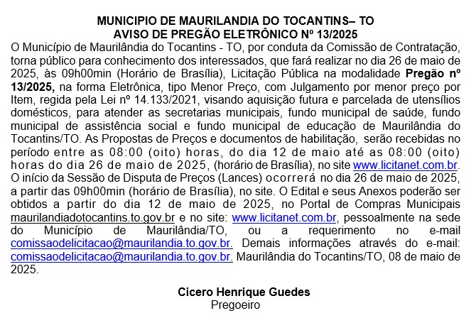 Publicidade Publicidade Geral MUNICÍPIO DE MAURILÂNDIA DO TO – AVISO DE PREGÃO ELETRÔNICO Nº 13/2025 By Folha do Bico 12 de maio de 2025 0 46 Share WhatsAppPrintTelegramFacebookTwitterCopy URL Folha do Bico Noticias Relacionadas Processo para tirar carteira de motorista fica mais simples, digital e barato em todo o país 9 de dezembro de 2025 Programa Acredita encerra ciclo 2025 com debates sobre crédito, inovação e gestão inteligente 8 de dezembro de 2025 Recorte Automático de Vídeo para uma Edição Multiformato Sem Esforço 5 de dezembro de 2025 Share WhatsAppPrintTelegramFacebookTwitterCopy URL Previous articleMUNICÍPIO DE MAURILÂNDIA DO TO – AVISO DE PREGÃO ELETRÔNICO Nº 12/2025Next articleMUNICÍPIO DE MAURILÂNDIA DO TO – AVISO DE PREGÃO ELETRÔNICO Nº 14/2025 - Advertisement - - Advertisement - Ultimas noticias Obras da Ponte JK estão 95% concluídos 13 de dezembro de 2025 SÃO MIGUEL: Ordem de serviço autoriza conclusão de creche paralisada há mais de uma década 12 de dezembro de 2025 Policial militar do Tocantins é preso após agressão covarde contra idoso flagrada em vídeo 12 de dezembro de 2025 TOCANTINÓPOLIS: Viatura da Polícia Federal é vista na Prefeitura 12 de dezembro de 2025 No Tocantins, jovem de 20 anos hackeia perfil de professora e pede nudes para alunas de 14 anos 12 de dezembro de 2025