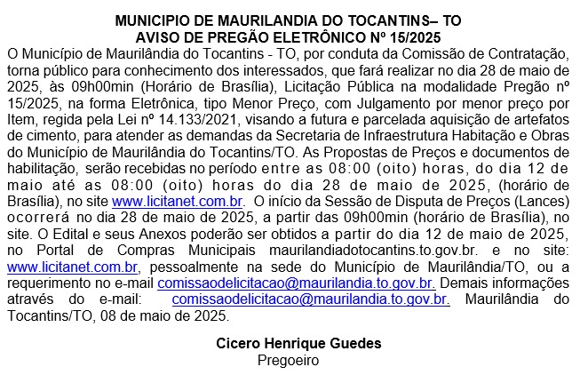 Publicidade Publicidade Geral MUNICÍPIO DE MAURILÂNDIA DO TO – AVISO DE PREGÃO ELETRÔNICO Nº 15/2025 By Folha do Bico 12 de maio de 2025 0 72 Share WhatsAppPrintTelegramFacebookTwitterCopy URL Folha do Bico Noticias Relacionadas PREFEITURA DE MAURILÂNDIA DO TO – ATO AVISO DE CONCORRÊNCIA ELETRÔNICA Nº 06/2025 – REPUBLICAÇÃO 2 de dezembro de 2025 PREFEITURA DE MAURILÂNDIA DO TO – ATO AVISO DE CONCORRÊNCIA ELETRÔNICA Nº 05/2025 – REPUBLICAÇÃO 2 de dezembro de 2025 PREFEITURA DE MAURILÂNDIA DO TO – ATO AVISO DE CONCORRÊNCIA ELETRÔNICA Nº 04/2025 – REPUBLICAÇÃO 2 de dezembro de 2025 Share WhatsAppPrintTelegramFacebookTwitterCopy URL Previous articleMUNICÍPIO DE MAURILÂNDIA DO TO – AVISO DE PREGÃO ELETRÔNICO Nº 14/2025Next articleMUNICÍPIO DE MAURILÂNDIA DO TO – AVISO DO PREGÃO PRESENCIAL Nº 16/2025 - Advertisement - - Advertisement - Ultimas noticias AUGUSTINÓPOLIS: Vigilante de abrigo é preso suspeito de abusar duas crianças 4 de dezembro de 2025 SÃO MIGUEL: Lixão é fechado e passa a ter acesso controlado sob novas diretrizes ambientais 4 de dezembro de 2025 ARAGUATINS: Insatisfeitos, Abmael, Chico Moura e Rafael Oliveira passam a votar com a oposição e complicam gestão Aquiles 4 de dezembro de 2025 ARAGUATINS: Com voto decisivo e comando da oposição, Airton se torna principal contraponto à gestão Aquiles 4 de dezembro de 2025