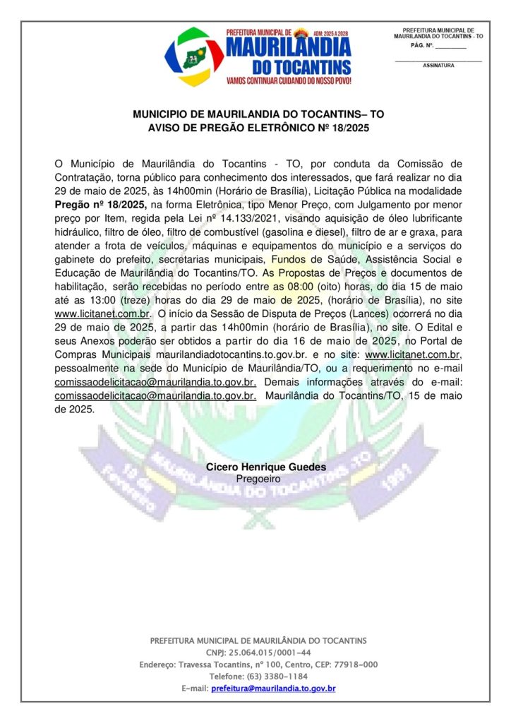 Publicidade Publicidade Geral MUNICÍPIO DE MAURILÂNDIA DO TO – AVISO DE PREGÃO ELETRÔNICO Nº 18/2025 By Folha do Bico 15 de maio de 2025 0 79 Share WhatsAppPrintTelegramFacebookTwitterCopy URL Folha do Bico Noticias Relacionadas PREFEITURA DE MAURILÂNDIA DO TO – ATO AVISO DE CONCORRÊNCIA ELETRÔNICA Nº 06/2025 – REPUBLICAÇÃO 2 de dezembro de 2025 PREFEITURA DE MAURILÂNDIA DO TO – ATO AVISO DE CONCORRÊNCIA ELETRÔNICA Nº 05/2025 – REPUBLICAÇÃO 2 de dezembro de 2025 PREFEITURA DE MAURILÂNDIA DO TO – ATO AVISO DE CONCORRÊNCIA ELETRÔNICA Nº 04/2025 – REPUBLICAÇÃO 2 de dezembro de 2025 Share WhatsAppPrintTelegramFacebookTwitterCopy URL Previous articleMUNICÍPIO DE MAURILÂNDIA DO TO – AVISO DE PREGÃO ELETRÔNICO Nº 17/2025Next articleMUNICÍPIO DE MAURILÂNDIA DO TO – AVISO DO PREGÃO PRESENCIAL Nº 19/2025 - Advertisement - - Advertisement - Ultimas noticias AUGUSTINÓPOLIS: Vigilante de abrigo é preso suspeito de abusar duas crianças 4 de dezembro de 2025 SÃO MIGUEL: Lixão é fechado e passa a ter acesso controlado sob novas diretrizes ambientais 4 de dezembro de 2025 ARAGUATINS: Insatisfeitos, Abmael, Chico Moura e Rafael Oliveira passam a votar com a oposição e complicam gestão Aquiles 4 de dezembro de 2025 ARAGUATINS: Com voto decisivo e comando da oposição, Airton se torna principal contraponto à gestão Aquiles 4 de dezembro de 2025