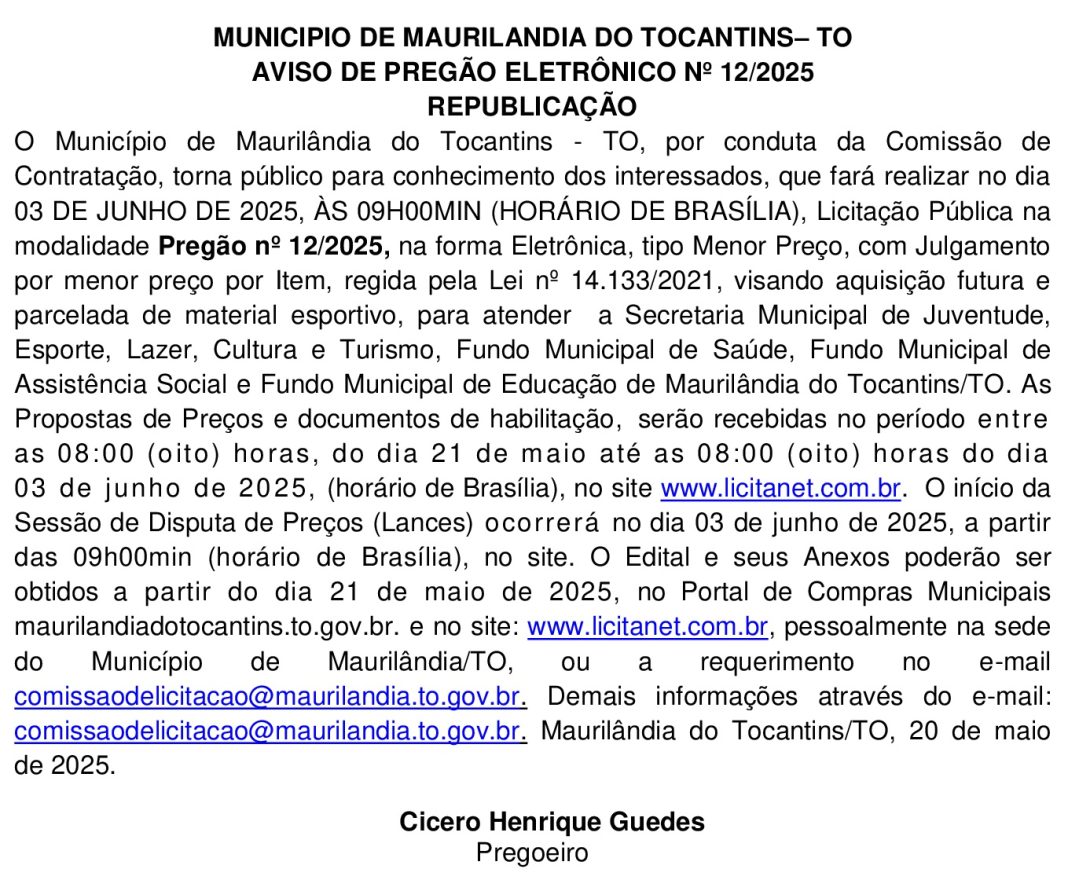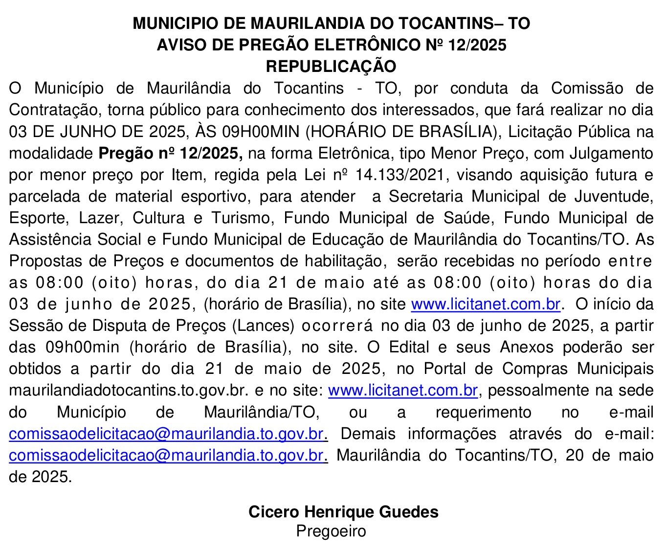 Publicidade Publicidade Geral MUNICÍPIO DE MAURILÂNDIA DO TO – AVISO DO PREGÃO PRESENCIAL Nº 12/2025 REPUBLICAÇÃO By Folha do Bico 20 de maio de 2025 0 87 Share WhatsAppPrintTelegramFacebookTwitterCopy URL Folha do Bico Noticias Relacionadas PREFEITURA DE MAURILÂNDIA DO TO – ATO AVISO DE CONCORRÊNCIA ELETRÔNICA Nº 06/2025 – REPUBLICAÇÃO 2 de dezembro de 2025 PREFEITURA DE MAURILÂNDIA DO TO – ATO AVISO DE CONCORRÊNCIA ELETRÔNICA Nº 05/2025 – REPUBLICAÇÃO 2 de dezembro de 2025 PREFEITURA DE MAURILÂNDIA DO TO – ATO AVISO DE CONCORRÊNCIA ELETRÔNICA Nº 04/2025 – REPUBLICAÇÃO 2 de dezembro de 2025 Share WhatsAppPrintTelegramFacebookTwitterCopy URL Previous articleLíderes legislativos debatem novas diretrizes para fortalecer políticas públicas em reunião nacionalNext articleMãe e filha são vítimas do mesmo abusador no interior do Tocantins - Advertisement - - Advertisement - Ultimas noticias AUGUSTINÓPOLIS: Vigilante de abrigo é preso suspeito de abusar duas crianças 4 de dezembro de 2025 SÃO MIGUEL: Lixão é fechado e passa a ter acesso controlado sob novas diretrizes ambientais 4 de dezembro de 2025 ARAGUATINS: Insatisfeitos, Abmael, Chico Moura e Rafael Oliveira passam a votar com a oposição e complicam gestão Aquiles 4 de dezembro de 2025 ARAGUATINS: Com voto decisivo e comando da oposição, Airton se torna principal contraponto à gestão Aquiles 4 de dezembro de 2025
