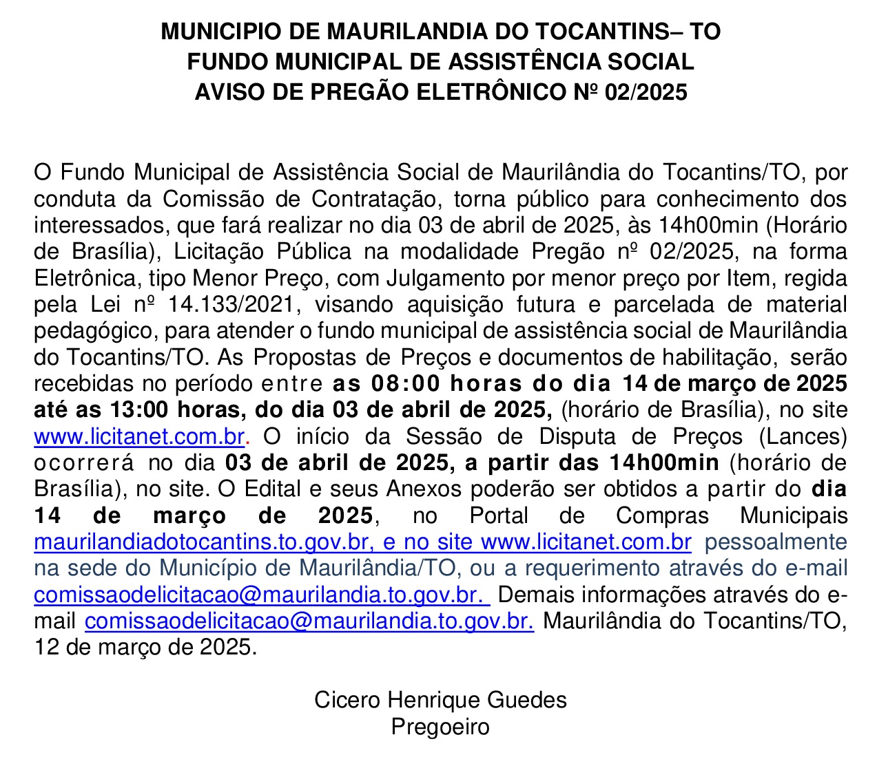 Publicidade Publicidade Geral MUNICÍPIO DE MAURILÂNDIA-TO – FUNDO MUNICIPAL DE ASSISTÊNCIA SOCIAL – AVISO DE PREGÃO ELETRÔNICO Nº 02/2025 By Folha do Bico 13 de março de 2025 0 55 Share WhatsAppPrintTelegramFacebookTwitterCopy URL Folha do Bico Noticias Relacionadas PREFEITURA DE MAURILÂNDIA DO TO – ATO AVISO DE CONCORRÊNCIA ELETRÔNICA Nº 06/2025 – REPUBLICAÇÃO 2 de dezembro de 2025 PREFEITURA DE MAURILÂNDIA DO TO – ATO AVISO DE CONCORRÊNCIA ELETRÔNICA Nº 05/2025 – REPUBLICAÇÃO 2 de dezembro de 2025 PREFEITURA DE MAURILÂNDIA DO TO – ATO AVISO DE CONCORRÊNCIA ELETRÔNICA Nº 04/2025 – REPUBLICAÇÃO 2 de dezembro de 2025 Share WhatsAppPrintTelegramFacebookTwitterCopy URL Previous articlePREFEITURA DE MAURILÂNDIA-TO – AVISO DE LICITAÇÃONext articlePREFEITURA DE MAURILÂNDIA-TO – FUNDO MUNICIPAL DE EDUCAÇÃO – AVISO DE PREGÃO ELETRÔNICO Nº 04/2025 - Advertisement - - Advertisement - Ultimas noticias AUGUSTINÓPOLIS: Vigilante de abrigo é preso suspeito de abusar duas crianças 4 de dezembro de 2025 SÃO MIGUEL: Lixão é fechado e passa a ter acesso controlado sob novas diretrizes ambientais 4 de dezembro de 2025 ARAGUATINS: Insatisfeitos, Abmael, Chico Moura e Rafael Oliveira passam a votar com a oposição e complicam gestão Aquiles 4 de dezembro de 2025 ARAGUATINS: Com voto decisivo e comando da oposição, Airton se torna principal contraponto à gestão Aquiles 4 de dezembro de 2025