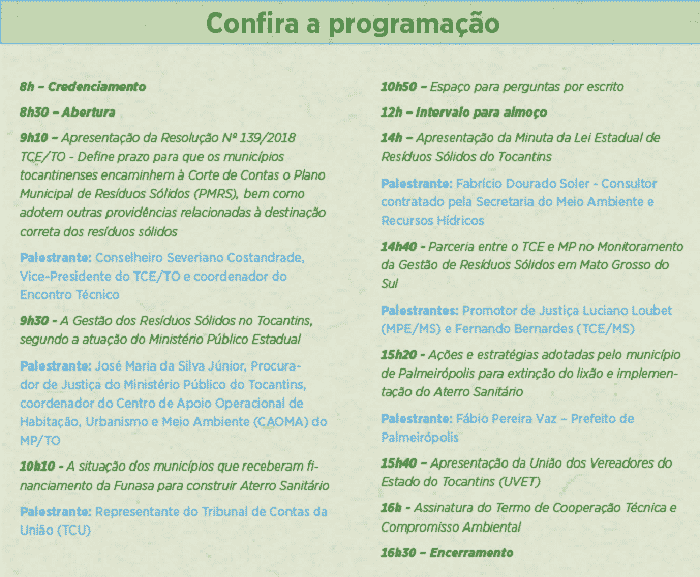 O objetivo é abordar assuntos de relevância a respeito da destinação correta dos resíduos sólidos, com vistas a orientar os gestores municipais para se adequarem às exigências da legislação. A programação conta com palestras sobre a atuação do Ministério Público do Tocantins na área, apresentação da minuta da Lei Estadual de Resíduos Sólidos e da resolução sobre o encaminhamento do Plano Municipal de Resíduos Sólidos, além de espaço para perguntas, dentre outros tópicos.