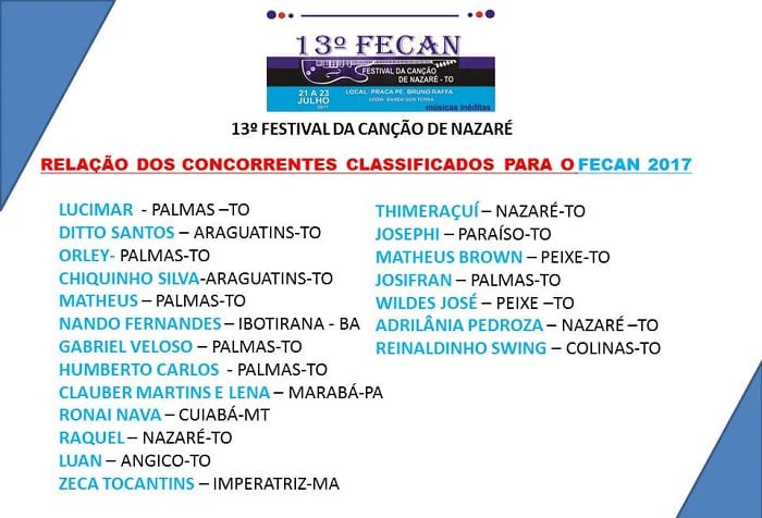 A 13ª edição do Festival da Canção de Nazaré (Fecan), em Nazaré, no Bico do Papagaio, será realizado nos dias 21, 22 e 23 de julho. Neste ano, serão vinte artistas disputando a premiação. Ao todo serão cantores de onze diferentes cidades de cinco estados brasileiros, TO, MA, PA, MT e BA.