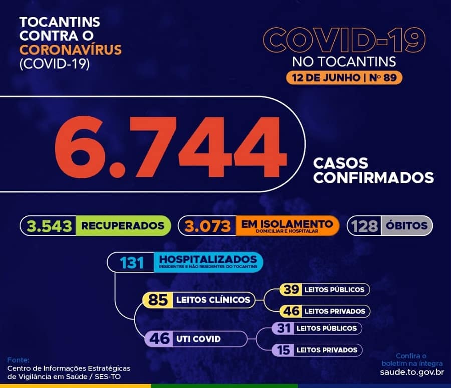 Desta forma, hoje o Tocantins contabiliza 6.744 casos confirmados da doença, destes 3.543 pacientes estão recuperados e 3.073 estão ainda em isolamento domiciliar ou hospitalar, além de 128 óbitos.