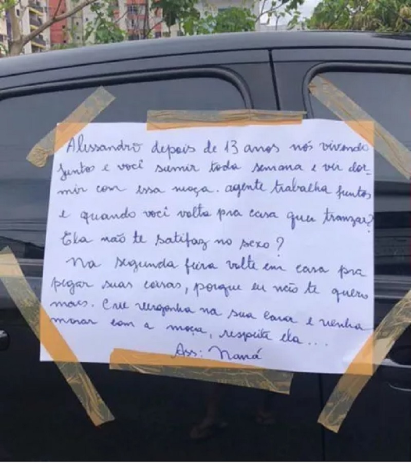 O bilhete chamou a atenção de quem passava pelo local pela forma como foi exposto, colado no carro de Alessandro. Naná pediu respeito à amante, sugerindo que o homem fosse morar com “a outra”.
