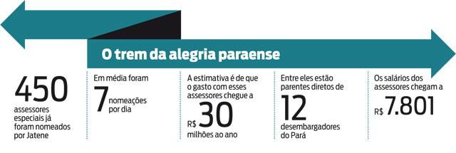 O que era para virar um exemplo de boa gestão, no entanto, ameaça tornar-se um escândalo. Em dois meses, a fim de acomodar interesses de diferentes setores, Jatene já deu posse a 450 novos assessores especiais, entre familiares de deputados aliados, de membros do Judiciário e de empresários amigos.
