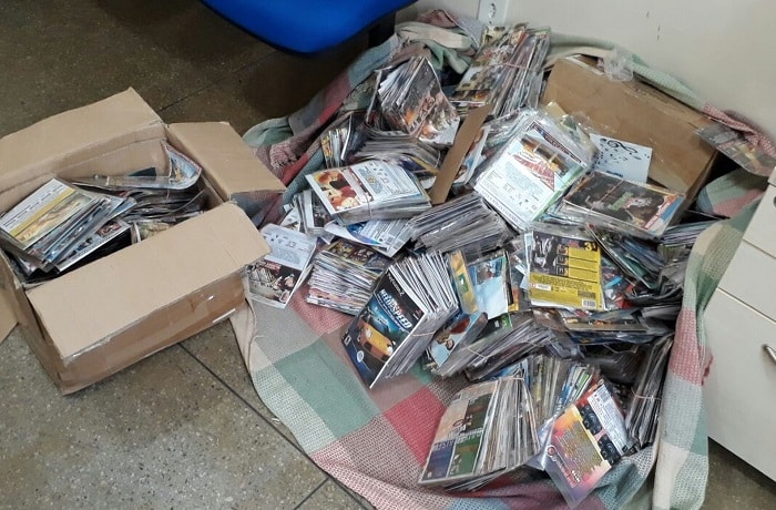 No ultimo sábado (14), após receber uma denúncia anônima, a equipe policial foi até o lado externo do Mercado Municipal para apurar possível venda ilegal de mídias piratas. No local, foram recolhidas 2.200 mídias piratas.