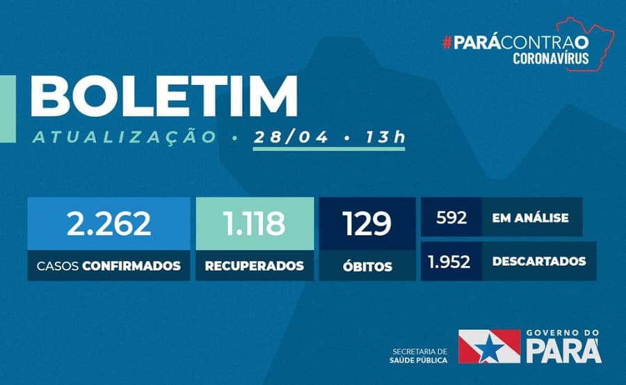 Minutos depois do boletim de óbitos, a Sespa confirmou mais 43 casos da Covid-19. Com as novas confirmações, o Pará chega a 2.262 positivados. Os novos casos são: