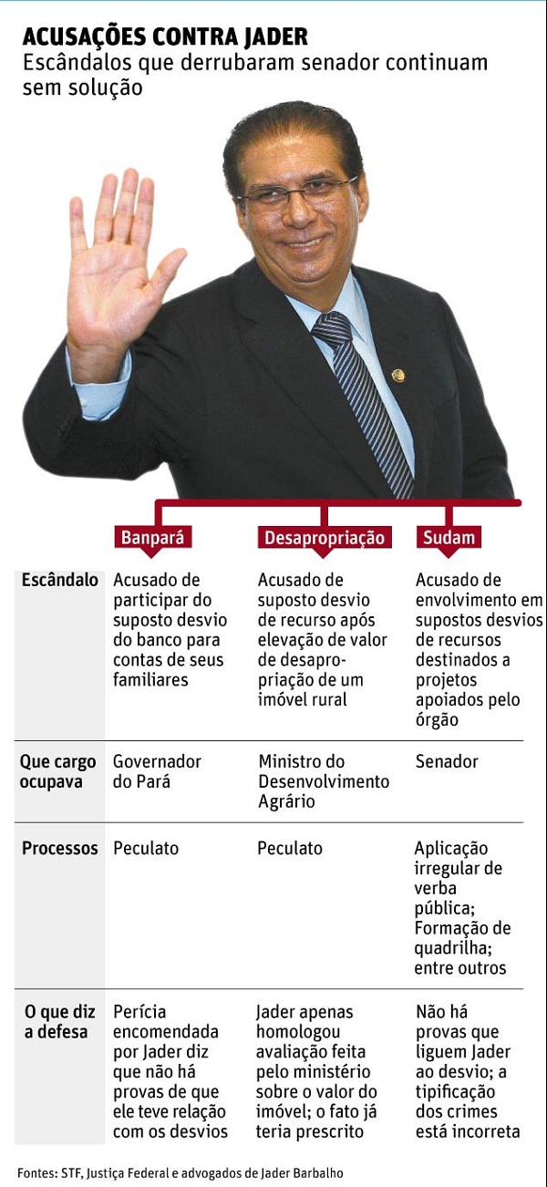 É importante lembrar que o grupo do Valciney está aliado com um dos maiores corruptos do país, o senador Jader Barbalho, e são do mesmo partido, o PMDB. Eles tramam juntos prejudicar nossa cidade, mas não vamos deixar. O Jader todo mundo conhece, só vive envolvido em escândalos, foi cassado, perdeu o mandato e nunca se limpou na Justiça. Teve parte dos bens bloqueados e imaginem vocês, foi preso em 2002. Será que são esses os lideres que o povo de Palestina merece?”, questionou o prefeito.