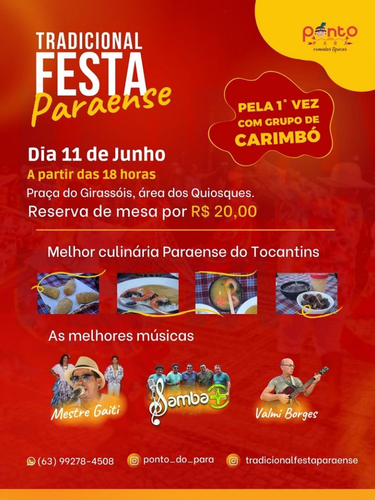 Neste sábado, em sua 6ª edição, acontecerá a Festa Tradicional Paraense que contará com uma vasta variedade culinária paraense e também com shows dos artistas paraenses Valmir Borges (voz e violão), o grupo de carimbó e dançarinos (Aurora de Cafezal) da Vila de Cafezal – Município Magalhães Barata, além da participação de artistas de Palmas como o Grupo Samba Mais e o músico Leandro Macêdo.