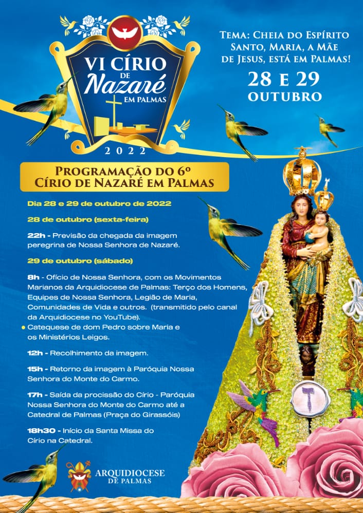 Nos próximos dias 28 e 29 de outubro acontece a 6ª edição do Círio de Nazaré em Palmas. A festa mariana que antes era realizada em novembro foi antecipada, por causa do Congresso Eucarístico Nacional, em Recife, e mais uma vez aquecerá os corações dos fiéis. A imagem peregrina de Nossa Senhora de Nazaré está com chegada prevista ao aeroporto de Palmas, proveniente de Belém, às 22h, do dia 28.