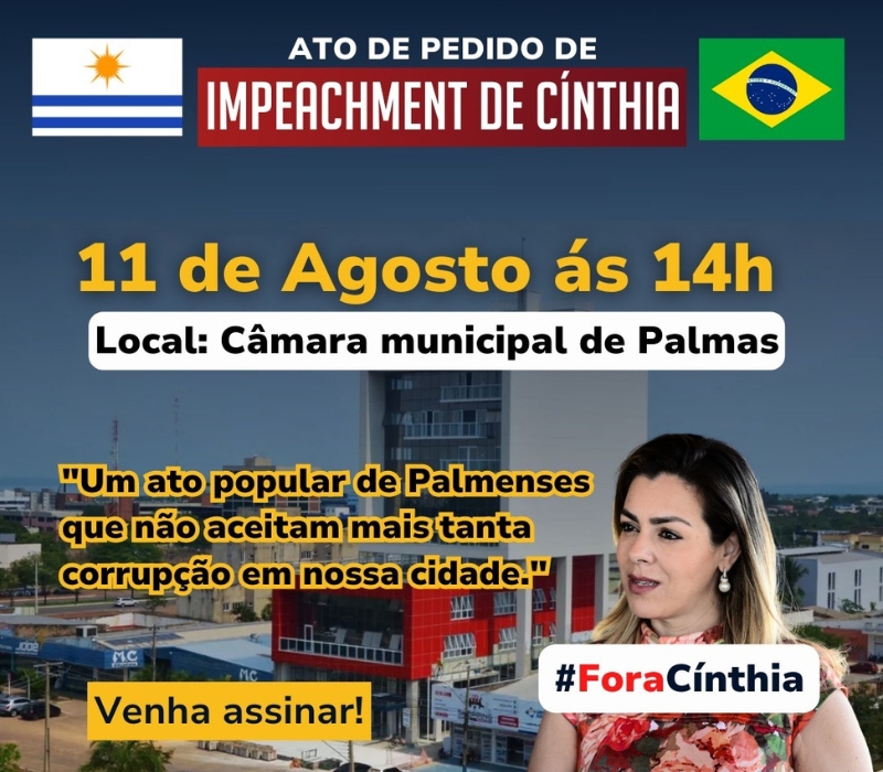 Populares preparam para esta sexta-feira, 11, na Câmara de Vereadores de Palmas, um ato, pelo pedido de impeachment da prefeito da capital, Cinthia Ribeiro (PSDB).