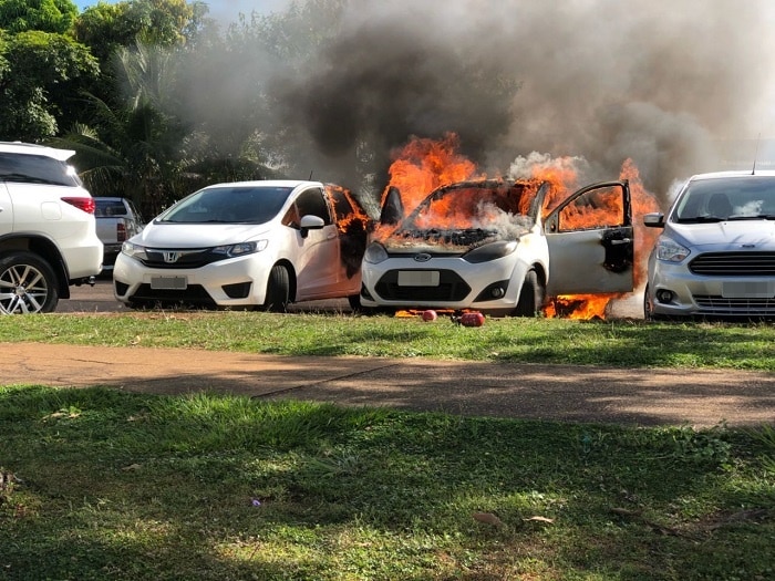 Além do carro onde o fogo começou, outros dois também foram atingidos e ficaram parcialmente destruídos. (G1/Foto: Silvana Lima)