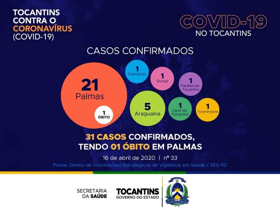 O Tocantins contabiliza agora 31 casos confirmados de Covid-19, nas cidades de Palmas (21), Araguaína (05), Gurupi (01), Dianópolis (01), Cariri do Tocantins (01), Paraíso do Tocantins (01) e Tocantinópolis (01).