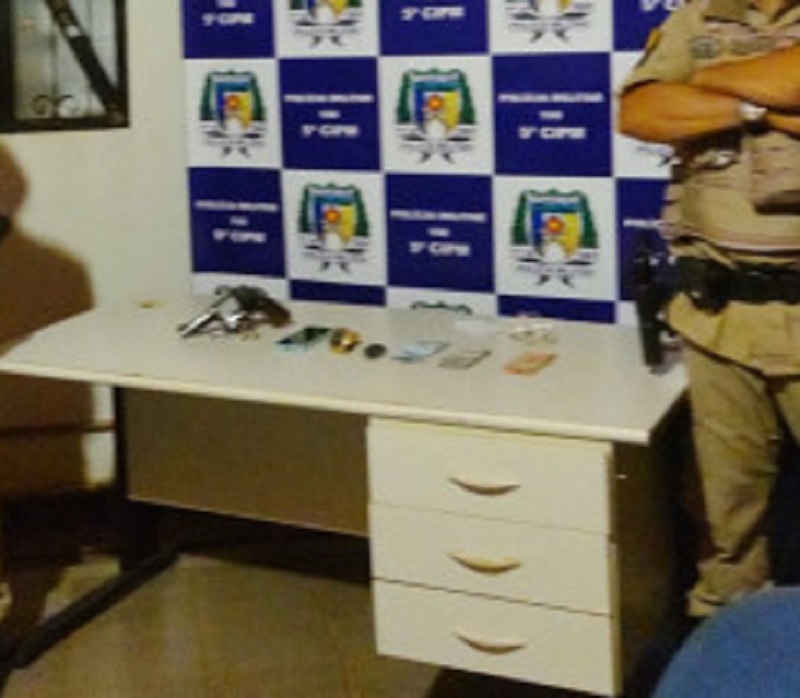 Com apoio da guarnição do CPU, apôs, as diligencias, o veículo foi localizado na avenida Airton Sena, no Centro da cidade, onde foi realizado busca pessoal nos ocupantes do veículo, bem como no interior do mesmo, sendo localizada embaixo do banco do motorista, uma arma de fogo cal. 38, com duas munições, sendo uma deflagrada e outra intacta.