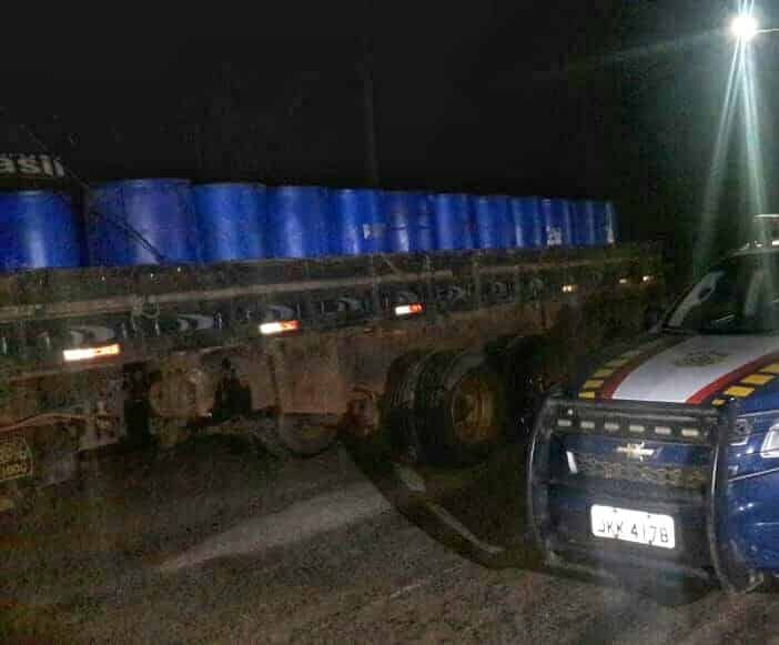 Ao realizar abordagem ao veículo Ford/Cargo 1722, foi solicitado ao condutor que apresentasse toda a documentação referente a carga qual transportava. A equipe da PRF constatou que o caminhão estava transportando 48 galões de óleo de soja para ração, com peso total de 9730kg, sem nota fiscal.