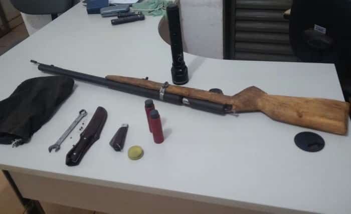 Durante a “Operação Pagamento”, a equipe em serviço deparou com um veículo suspeito e procedeu a abordagem. No interior do mesmo foi encontrada uma espingarda de fabricação caseira e dois animais silvestres abatidos, uma capivara e uma paca.