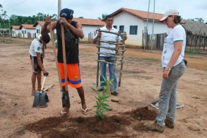Graças à parceria com a Secretaria de Estado de Meio Ambiente (Sema), a zootecnista Giselle Leandro orientou durante dois dias os participantes da atividade a fazer o plantio de 42 mudas de árvores frutíferas no entorno da aldeia. O auxiliar técnico da Sema Adailton Brito também participou da construção e colocação das proteções de madeira das mudas de manga, goiaba, oiti e fruta-do-conde, doadas pela Secretaria de Agricultura de São Geraldo do Araguaia.