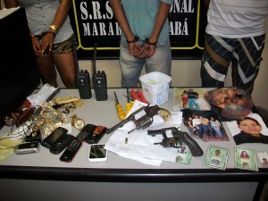 Na casa os policiais encontraram dois revólveres, munição e dois rádios de comunicação. No desdobramento das investigações, foi presa a dona da casa Neuzilene Santana Moreira, 32 anos; Caio Ramos Azevedo, 21, e um adolescente fugitivo do Centro de Internação do Adolescente Masculino (CIAM). Um carro com placa de Ananindeua, município da Grande Belém, que seria de propriedade de “Fuá”, foi apreendido. Outras duas casas foram revistadas e, nelas, apreendidos objetos que seriam fruto de roubos. As investigações prosseguem para localizar e prender os demais envolvidos no bando. Todos já estão com prisões solicitadas à Justiça. (Walrimar Santos)