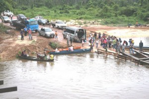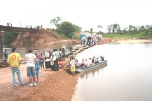 Está sendo providenciada uma balsa para fazer a passagem dos veículos. A ponte de concreto existente no local está sendo reformada, e a obra ficou interrompida durante meses. Há infomações que o trabalho de reforma da ponte foi reiniciado essa semana. (Otávio Araújo)