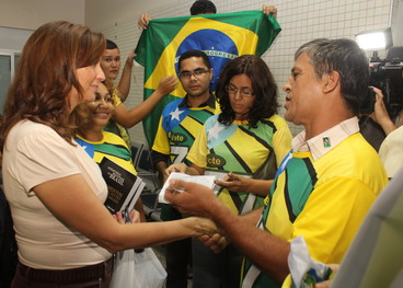 Políticos, empresários, membros da Comissão Brandão e outras pessoas aguardavam desde às 21 horas no aeroporto, trajando camisetas e portando bandeiras e faixas favoráveis à criação do Carajás.
