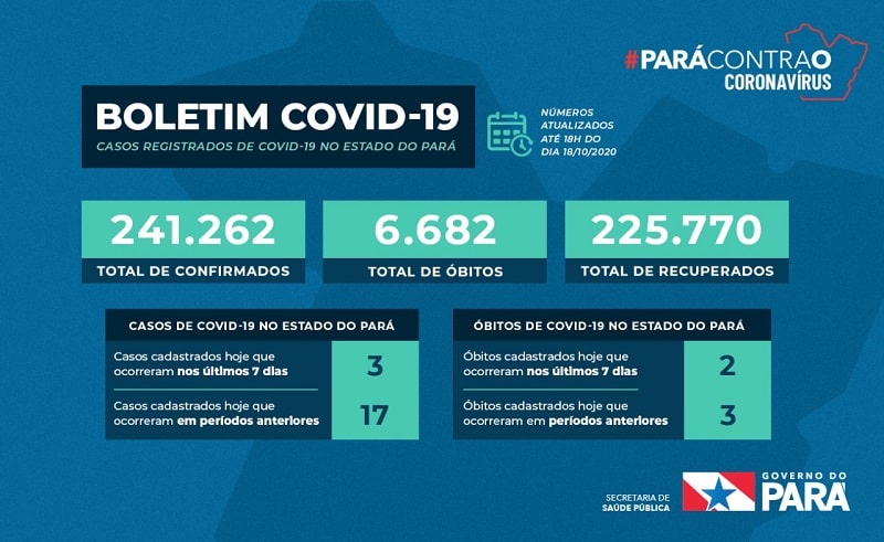 A Secretaria de Saúde do Pará (Sespa) confirmou neste domingo (18) mais 20 casos de Covid-19 e cinco mortes. Agora são 241.262 casos de Covid-19 e 6.682 óbitos no estado.