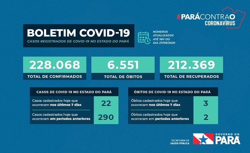A Secretaria de Saúde do Pará (Sespa) confirmou neste domingo (27) mais 312 casos de Covid-19 e 5 mortes. Agora são 228.068 casos e 6.551 óbitos no estado. São 166.391 recuperados, até então.