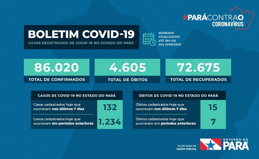A Secretaria de Saúde do Pará (Sespa) confirmou neste domingo (21) mais 132 novos casos de Covid-19 e 15 óbitos cadastrados hoje e que ocorreram nos últimos 7 dias. Em relação à subnotificação das prefeituras, confirmamos mais 1.234 casos e 7 óbitos acontecidos em dias anteriores. Agora são 86.020 casos e 4.605 óbitos por Covid-19 no estado.