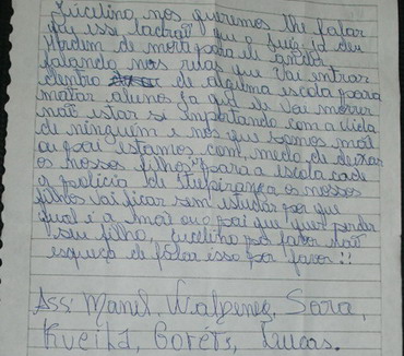 Sérgio Máximo afirma entretanto, que não há ordem judicial contra Elton, mas a polícia vem acompanhando os passos do jovem que, de acordo com o delegado, possui extensa lista de crimes. Com a notícia, muitos alunos não estão frequentando as escolas, o que causou uma preocupação entre os profissionais da Educação.