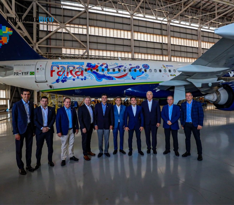 Plotagem especial – Durante a visita técnica ao hangar da Azul, o governador e o ministro foram convidados pelo presidente da companhia para conhecer a nova plotagem realizada em uma aeronave da companhia em homenagem ao Pará .