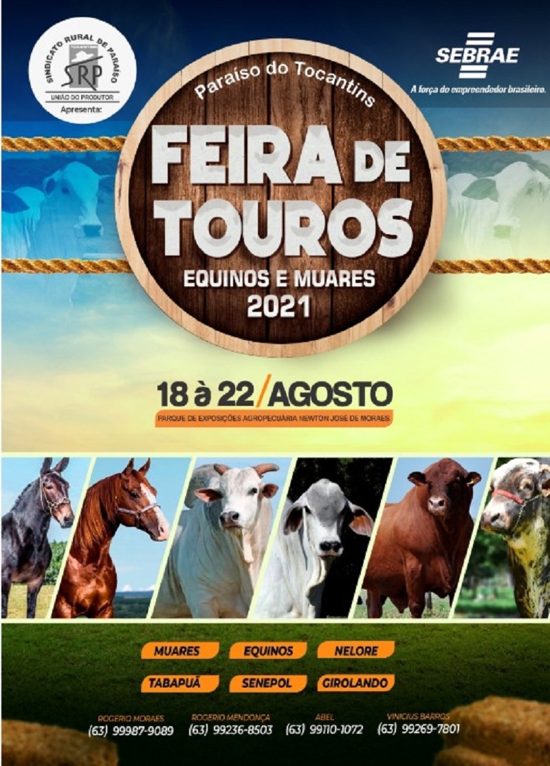 Com o objetivo de reposicionar o pequeno produtor no mercado, o Sindicato Rural de Paraíso do Tocantins (SRP) promove de 18 a 22 de agosto, a Feira de Touros, Equinos e Muares de 2021. O evento será realizado no Parque de Exposições Agropecuárias Newton Moraes, setor aeroporto, das 8h às 18h, onde serão apresentadas estrelas das raças nelore, tabapuã, senepol e girolando. O Sebrae estará presente, com atendimento, orientações e oferecendo soluções para o segmento do agronegócio.