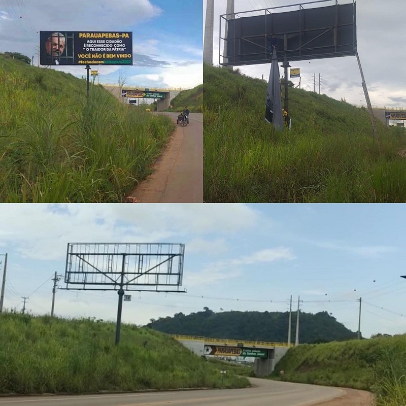 Uma propaganda que havia sido instalada próximo ao viaduto, na entrada de Parauapebas, na região de Carajás, Pará, feita por bolsonaristas, atacando o pré-candidato do PT, Lula, foi retirada na manhã desta sexta-feira, 4.