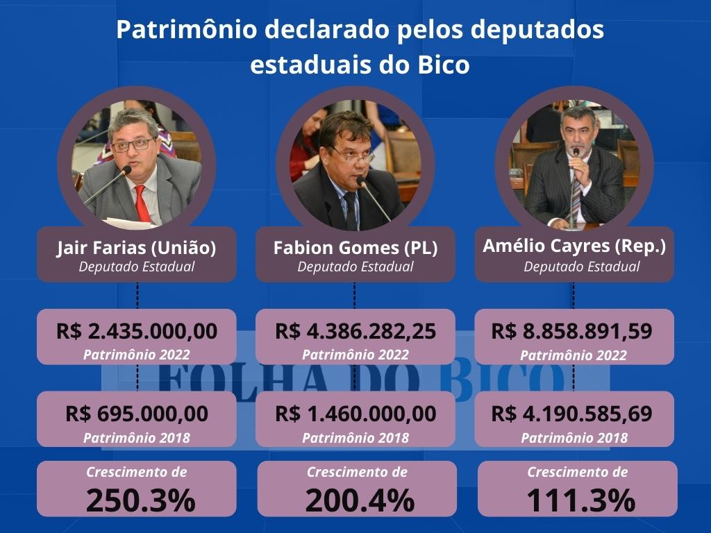 Jair Farias (União), foi o deputado que apresentou maior crescimento de patrimônio durante essa legislatura, entre os três do Bico do Papagaio. Na eleição de 2018, quando tentou e conseguiu vencer a eleição, Jair disse a Justiça, ter R$ 695.000,00. Agora, em 2022, ele declarou uma pequena fortuna, avaliada em R$ 2.435.000,00. Um crescimento de cerca de 250.3% em quatro anos.