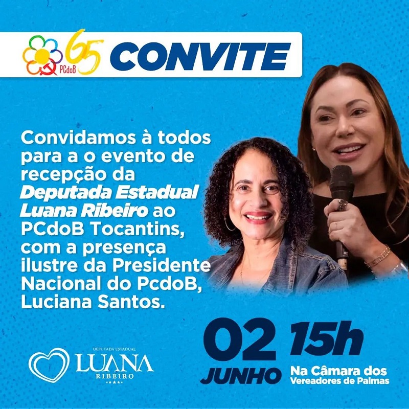 No dia 2 de junho, o PCdoB do Tocantins, reunirá sua militância para um evento de recepção da deputado estadual, Luana Ribeiro. O evento terá a presença da presidente nacional do partido e vice-governadora de Pernambuco, Luciana Santos.