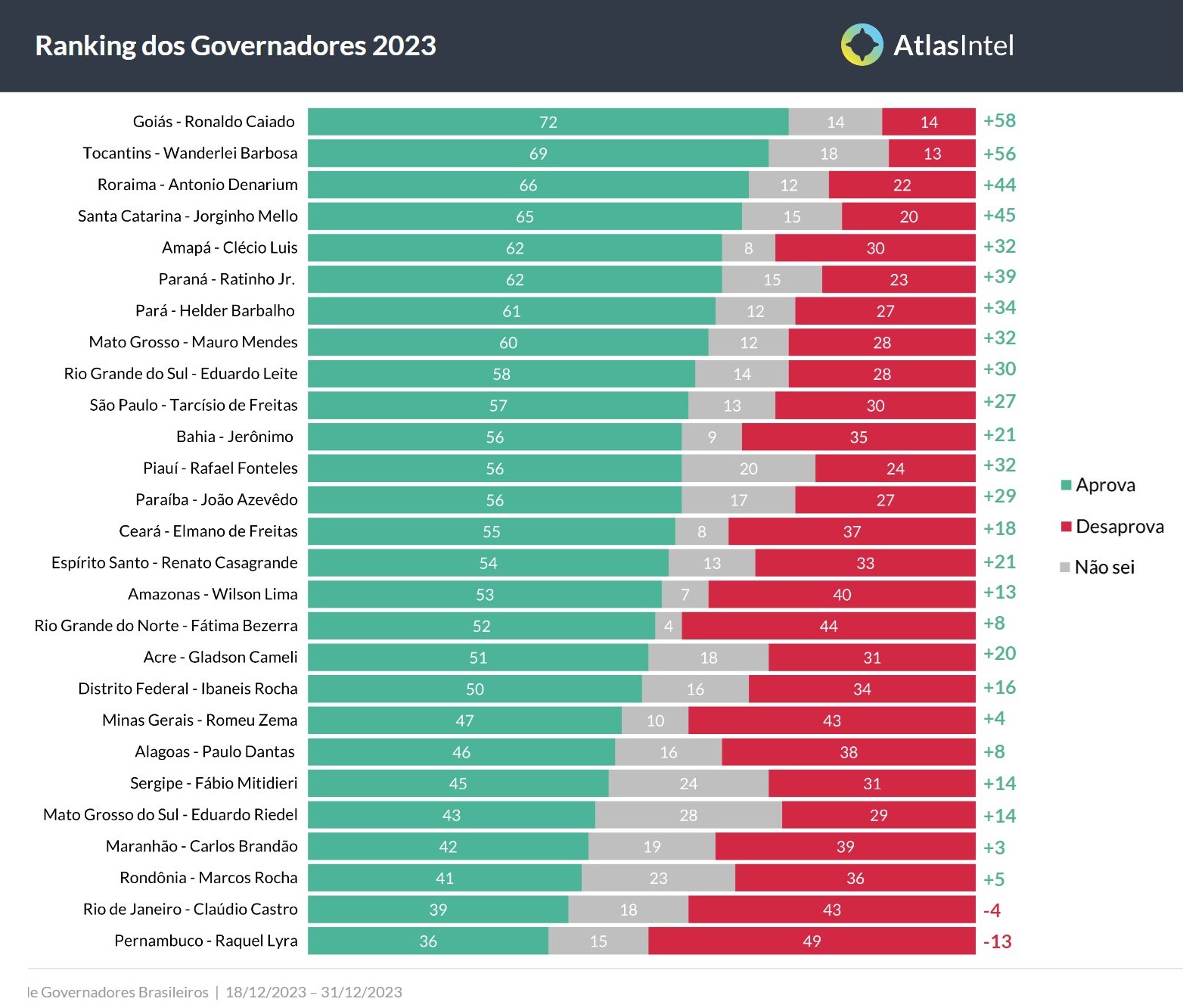O governador de Goiás, Ronaldo Caiado, concluiu o ano de 2023 com o maior nível de aprovação entre todos os governadores do país: 72%. Em seguida, em empate técnico, aparece Wanderlei Barbosa, o governador do Tocantins.