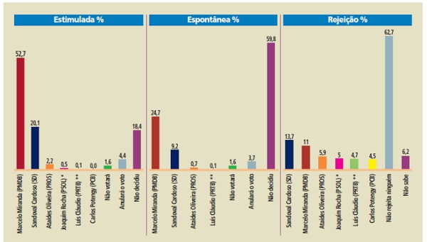 Com 24,7%, Marcelo Miranda, da coligação A experiência faz a mudança, também ocupa o primeiro lugar na consulta espontânea, aquela em que os entrevistados não têm acesso aos nomes dos candidatos na hora de responder em quem votam. Em segundo lugar, com 9,2%, aparece novamente Sandoval, da coligação A mudança que a gente vê. Ataídes (0,7%) , da coligação Reage Tocantins, e Luiz Cláudio (0,1%) foram os outros citados.