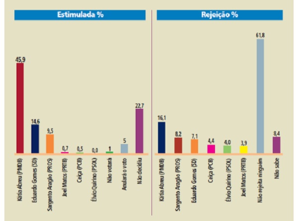 O levantamento estimulado apontou ainda que os candidatos Joel Matos (PRTB) e Ceiça (PCB) obtiveram, respectivamente, 0,7% e 0,5%, ao passo que Élvio Quirino (PSOL) ficou com 0%. Ainda de acordo com a consulta estimulada, 22,7% dos entrevistados se mostraram indecisos, ao passo que 5% garantiram que irão anular o voto e 1% que não votará.