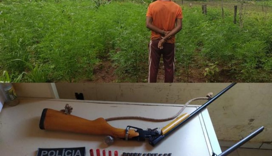 Em ato seguinte, a Polícia Militar deslocou até o imóvel rural do segundo autor masculino de 54 anos, onde sua esposa permitiu a busca domiciliar, sendo encontrada uma espingarda cartucheira calibre 32, sem numeração, assim como uma quantidade indeterminada de sementes de maconha, três cartuchos calibre 32 marca CBC e duas garrafas pets contendo folhas análogas à maconha submersa em líquido. Ainda em vistoria na área externa foram encontrados a aproximadamente 70 metros do imóvel plantas com características semelhantes à maconha (cannabis sativa), cultivada pelo segundo autor sem autorização e em desacordo com determinação legal e regulamentar.
