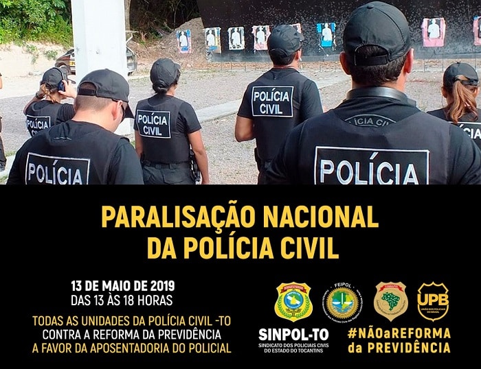 Atendendo convocação da Confederação Brasileira de Trabalhadores Policiais Civis – Cobrapol, o SINPOL-TO convocou os Políciais Civis em todas as cidades do Tocantins a paralisarem suas atividades nesta segunda-feira, das 13h às 18h, em manifestação contra a Reforma da Previdência e a favor da Aposentadoria Policial.
