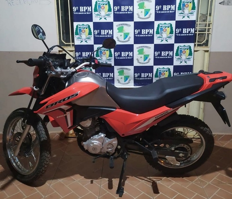 Motocicleta Honda NXR, placa de Praia Norte-TO, apreendida pela PM durante patrulhamento no início da noite de segunda-feira, 07, no centro da cidade de Praia Norte, no Bico do Papagaio.