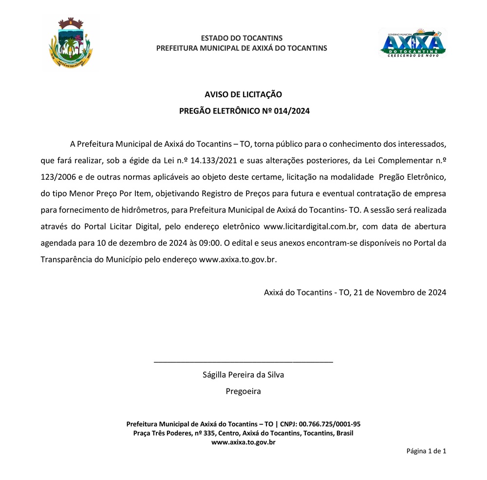 Publicidade Publicidade Geral PREFEITURA AXIXÁ DO TO – AVISO DE LICITAÇÃO – PREGÃO ELETRÔNICO Nº 014/2024 By Folha do Bico 25 de novembro de 2024 0 25 Share WhatsAppPrintTelegramFacebookTwitterCopy URL Folha do Bico Noticias Relacionadas PREFEITURA DE MAURILÂNDIA DO TO – ATO AVISO DE CONCORRÊNCIA ELETRÔNICA Nº 06/2025 – REPUBLICAÇÃO 2 de dezembro de 2025 PREFEITURA DE MAURILÂNDIA DO TO – ATO AVISO DE CONCORRÊNCIA ELETRÔNICA Nº 05/2025 – REPUBLICAÇÃO 2 de dezembro de 2025 PREFEITURA DE MAURILÂNDIA DO TO – ATO AVISO DE CONCORRÊNCIA ELETRÔNICA Nº 04/2025 – REPUBLICAÇÃO 2 de dezembro de 2025 Share WhatsAppPrintTelegramFacebookTwitterCopy URL Previous articleCACHOERINHA: Bela Vista avança às semifinais da Segunda Divisão do TocantinenseNext articlePREFEITURA AXIXÁ DO TO – AVISO DE LICITAÇÃO – PREGÃO ELETRÔNICO Nº 015/2024 - Advertisement - - Advertisement - Ultimas noticias AUGUSTINÓPOLIS: Vigilante de abrigo é preso suspeito de abusar duas crianças 4 de dezembro de 2025 SÃO MIGUEL: Lixão é fechado e passa a ter acesso controlado sob novas diretrizes ambientais 4 de dezembro de 2025 ARAGUATINS: Insatisfeitos, Abmael, Chico Moura e Rafael Oliveira passam a votar com a oposição e complicam gestão Aquiles 4 de dezembro de 2025 ARAGUATINS: Com voto decisivo e comando da oposição, Airton se torna principal contraponto à gestão Aquiles 4 de dezembro de 2025