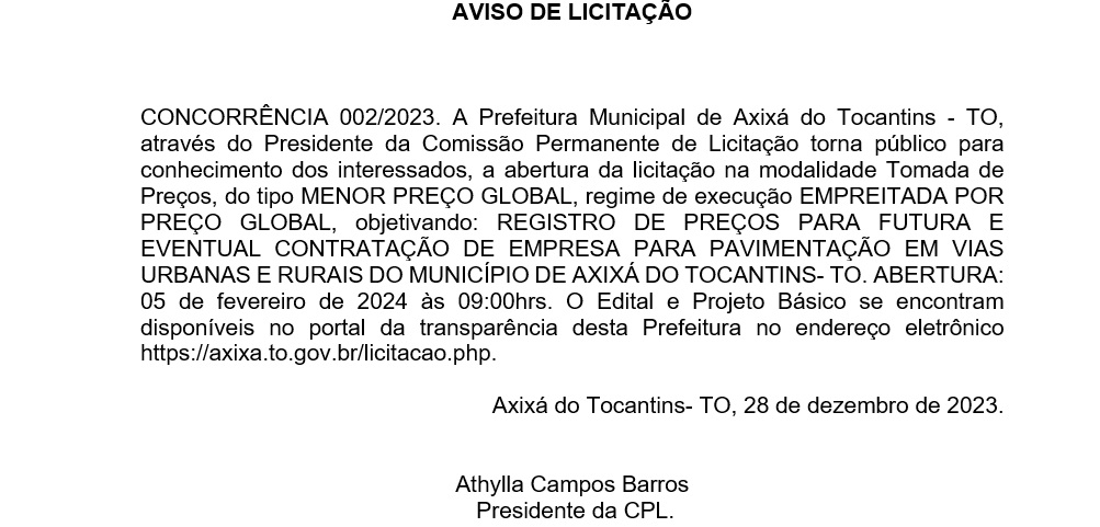 Publicidade Publicidade Geral PREFEITURA AXIXÁ DO TOCANTINS – AVISO DE LICITAÇÃO By Folha do Bico 28 de dezembro de 2023 0 193 Share WhatsAppPrintTelegramFacebookTwitterCopy URL Folha do Bico Noticias Relacionadas Recorte Automático de Vídeo para uma Edição Multiformato Sem Esforço 5 de dezembro de 2025 PREFEITURA DE MAURILÂNDIA DO TO – ATO AVISO DE CONCORRÊNCIA ELETRÔNICA Nº 06/2025 – REPUBLICAÇÃO 2 de dezembro de 2025 PREFEITURA DE MAURILÂNDIA DO TO – ATO AVISO DE CONCORRÊNCIA ELETRÔNICA Nº 05/2025 – REPUBLICAÇÃO 2 de dezembro de 2025 Share WhatsAppPrintTelegramFacebookTwitterCopy URL Previous articlePRAIA NORTE: Igor Silva de Oliveira; O lavrador que sobreviveu a um tronco de árvore cravado no peitoNext articleARAGUATINS: Violência doméstica. Músico é preso após agredir companheira - Advertisement - - Advertisement - Ultimas noticias Para Nunes Marques, afastamento de Wanderlei era excessivo e violava estabilidade institucional 5 de dezembro de 2025 STF derruba afastamento de Wanderlei Barbosa e governador reassume mandato 5 de dezembro de 2025 AUGUSTINÓPOLIS: Acender das Luzes celebra 4ª edição da Magia do Natal com espetáculo especial nesta sexta-feira 5 de dezembro de 2025 44 mil famílias sem casa. Enquanto isso, a política do Tocantins segue repetindo promessas que nunca saem do papel 5 de dezembro de 2025
