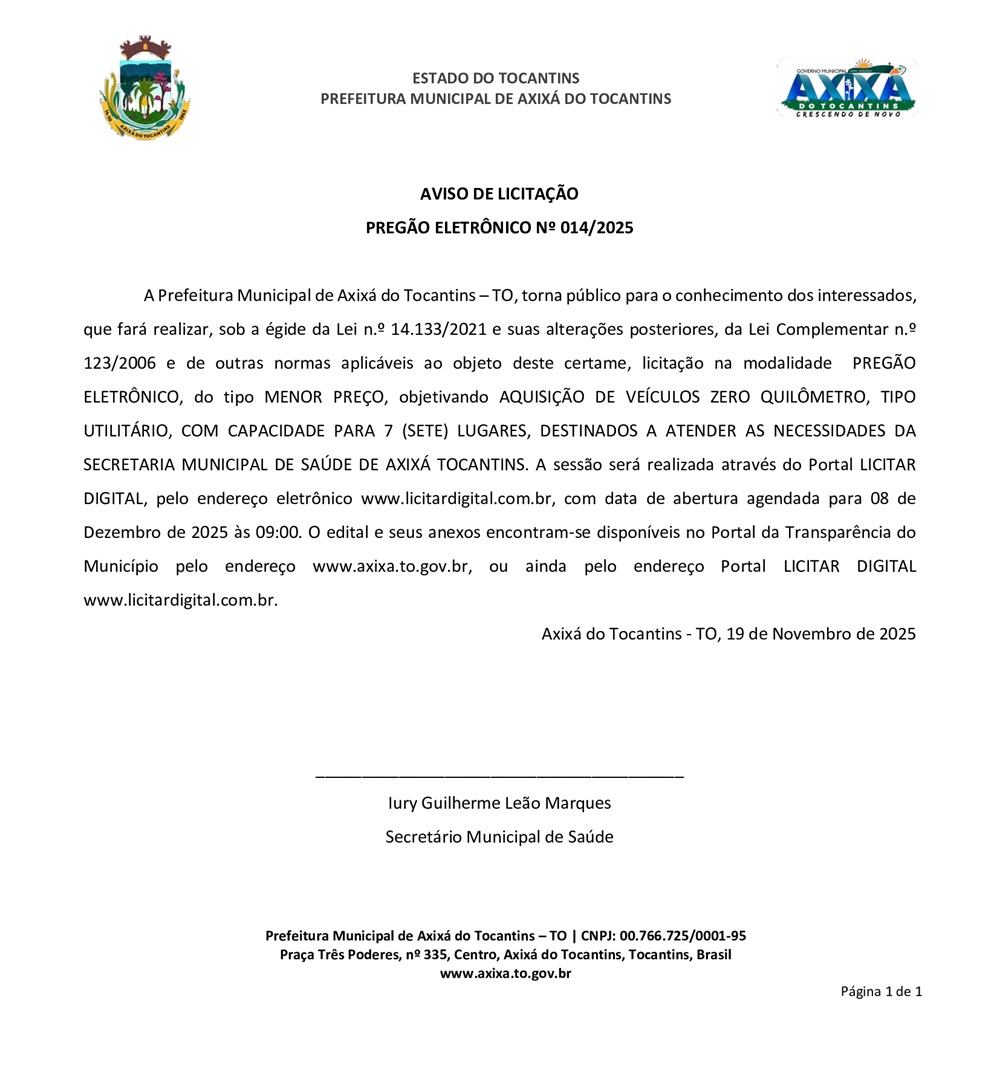 Publicidade Publicidade Geral PREFEITURA DE AXIXÁ – AVISO DE LICITAÇÃO PREGÃO ELETRÔNICO Nº 014/2025 By Folha do Bico 21 de novembro de 2025 0 362 Share WhatsAppPrintTelegramFacebookTwitterCopy URL Folha do Bico Noticias Relacionadas PREFEITURA DE MAURILÂNDIA DO TO – ATO AVISO DE CONCORRÊNCIA ELETRÔNICA Nº 06/2025 – REPUBLICAÇÃO 2 de dezembro de 2025 PREFEITURA DE MAURILÂNDIA DO TO – ATO AVISO DE CONCORRÊNCIA ELETRÔNICA Nº 05/2025 – REPUBLICAÇÃO 2 de dezembro de 2025 PREFEITURA DE MAURILÂNDIA DO TO – ATO AVISO DE CONCORRÊNCIA ELETRÔNICA Nº 04/2025 – REPUBLICAÇÃO 2 de dezembro de 2025 Share WhatsAppPrintTelegramFacebookTwitterCopy URL Previous articleProcesso seletivo do IBGE oferece 19 vagas para Araguatins e TocantinópolisNext articlePREFEITURA DE AXIXÁ – AVISO DE LICITAÇÃO PREGÃO ELETRÔNICO Nº 015/2025 - Advertisement - - Advertisement - Ultimas noticias AUGUSTINÓPOLIS: Vigilante de abrigo é preso suspeito de abusar duas crianças 4 de dezembro de 2025 SÃO MIGUEL: Lixão é fechado e passa a ter acesso controlado sob novas diretrizes ambientais 4 de dezembro de 2025 ARAGUATINS: Insatisfeitos, Abmael, Chico Moura e Rafael Oliveira passam a votar com a oposição e complicam gestão Aquiles 4 de dezembro de 2025 ARAGUATINS: Com voto decisivo e comando da oposição, Airton se torna principal contraponto à gestão Aquiles 4 de dezembro de 2025