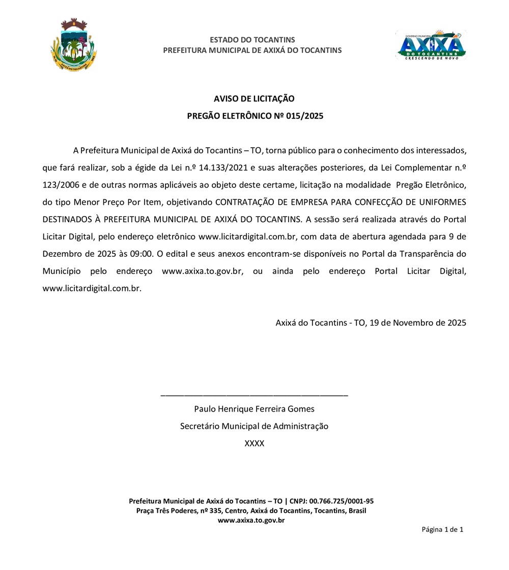 Publicidade Publicidade Geral PREFEITURA DE AXIXÁ – AVISO DE LICITAÇÃO PREGÃO ELETRÔNICO Nº 015/2025 By Folha do Bico 21 de novembro de 2025 0 437 Share WhatsAppPrintTelegramFacebookTwitterCopy URL Folha do Bico Noticias Relacionadas PREFEITURA DE MAURILÂNDIA DO TO – ATO AVISO DE CONCORRÊNCIA ELETRÔNICA Nº 06/2025 – REPUBLICAÇÃO 2 de dezembro de 2025 PREFEITURA DE MAURILÂNDIA DO TO – ATO AVISO DE CONCORRÊNCIA ELETRÔNICA Nº 05/2025 – REPUBLICAÇÃO 2 de dezembro de 2025 PREFEITURA DE MAURILÂNDIA DO TO – ATO AVISO DE CONCORRÊNCIA ELETRÔNICA Nº 04/2025 – REPUBLICAÇÃO 2 de dezembro de 2025 Share WhatsAppPrintTelegramFacebookTwitterCopy URL Previous articlePREFEITURA DE AXIXÁ – AVISO DE LICITAÇÃO PREGÃO ELETRÔNICO Nº 014/2025Next articleCampeonato Tocantinense 2025 Segunda Divisão: semifinais começam com duelos decisivos neste sábado - Advertisement - - Advertisement - Ultimas noticias AUGUSTINÓPOLIS: Vigilante de abrigo é preso suspeito de abusar duas crianças 4 de dezembro de 2025 SÃO MIGUEL: Lixão é fechado e passa a ter acesso controlado sob novas diretrizes ambientais 4 de dezembro de 2025 ARAGUATINS: Insatisfeitos, Abmael, Chico Moura e Rafael Oliveira passam a votar com a oposição e complicam gestão Aquiles 4 de dezembro de 2025 ARAGUATINS: Com voto decisivo e comando da oposição, Airton se torna principal contraponto à gestão Aquiles 4 de dezembro de 2025