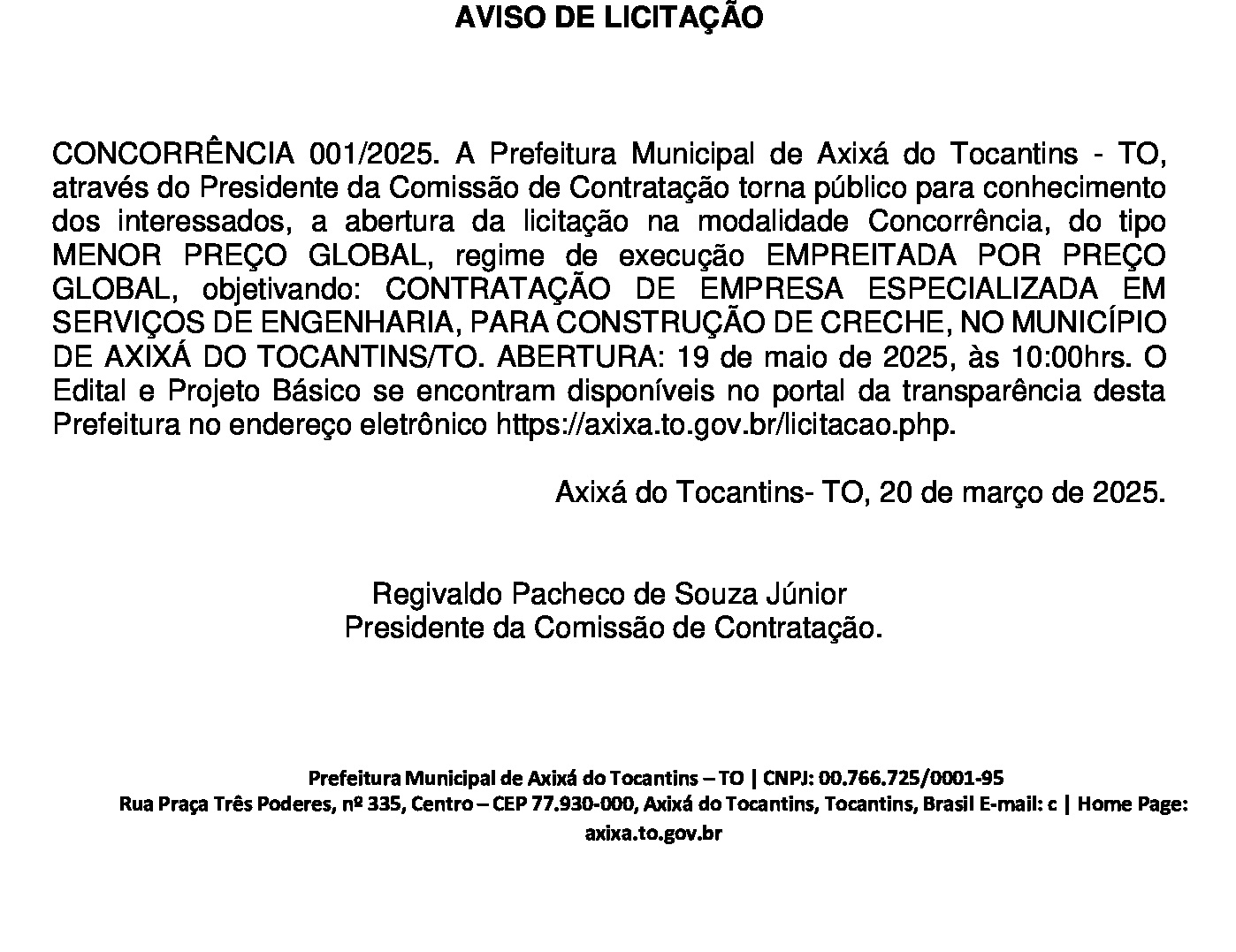 Publicidade Publicidade Geral PREFEITURA DE AXIXÁ DO TO – AVISO DE LICITAÇÃO – CONCORRÊNCIA 001/2025 By Folha do Bico 25 de março de 2025 0 49 Share WhatsAppPrintTelegramFacebookTwitterCopy URL Folha do Bico Noticias Relacionadas PREFEITURA DE MAURILÂNDIA DO TO – ATO AVISO DE CONCORRÊNCIA ELETRÔNICA Nº 06/2025 – REPUBLICAÇÃO 2 de dezembro de 2025 PREFEITURA DE MAURILÂNDIA DO TO – ATO AVISO DE CONCORRÊNCIA ELETRÔNICA Nº 05/2025 – REPUBLICAÇÃO 2 de dezembro de 2025 PREFEITURA DE MAURILÂNDIA DO TO – ATO AVISO DE CONCORRÊNCIA ELETRÔNICA Nº 04/2025 – REPUBLICAÇÃO 2 de dezembro de 2025 Share WhatsAppPrintTelegramFacebookTwitterCopy URL Previous articleARAGUATINS: IFTO/EAFA celebra 37 anos nesta terça, 25, com programação especial e olhar para o futuroNext articleARAGUATINS: Deputado Wiston Gomes destina R$ 100 mil para construção da sede da Patrulha Rural - Advertisement - - Advertisement - Ultimas noticias AUGUSTINÓPOLIS: Vigilante de abrigo é preso suspeito de abusar duas crianças 4 de dezembro de 2025 SÃO MIGUEL: Lixão é fechado e passa a ter acesso controlado sob novas diretrizes ambientais 4 de dezembro de 2025 ARAGUATINS: Insatisfeitos, Abmael, Chico Moura e Rafael Oliveira passam a votar com a oposição e complicam gestão Aquiles 4 de dezembro de 2025 ARAGUATINS: Com voto decisivo e comando da oposição, Airton se torna principal contraponto à gestão Aquiles 4 de dezembro de 2025