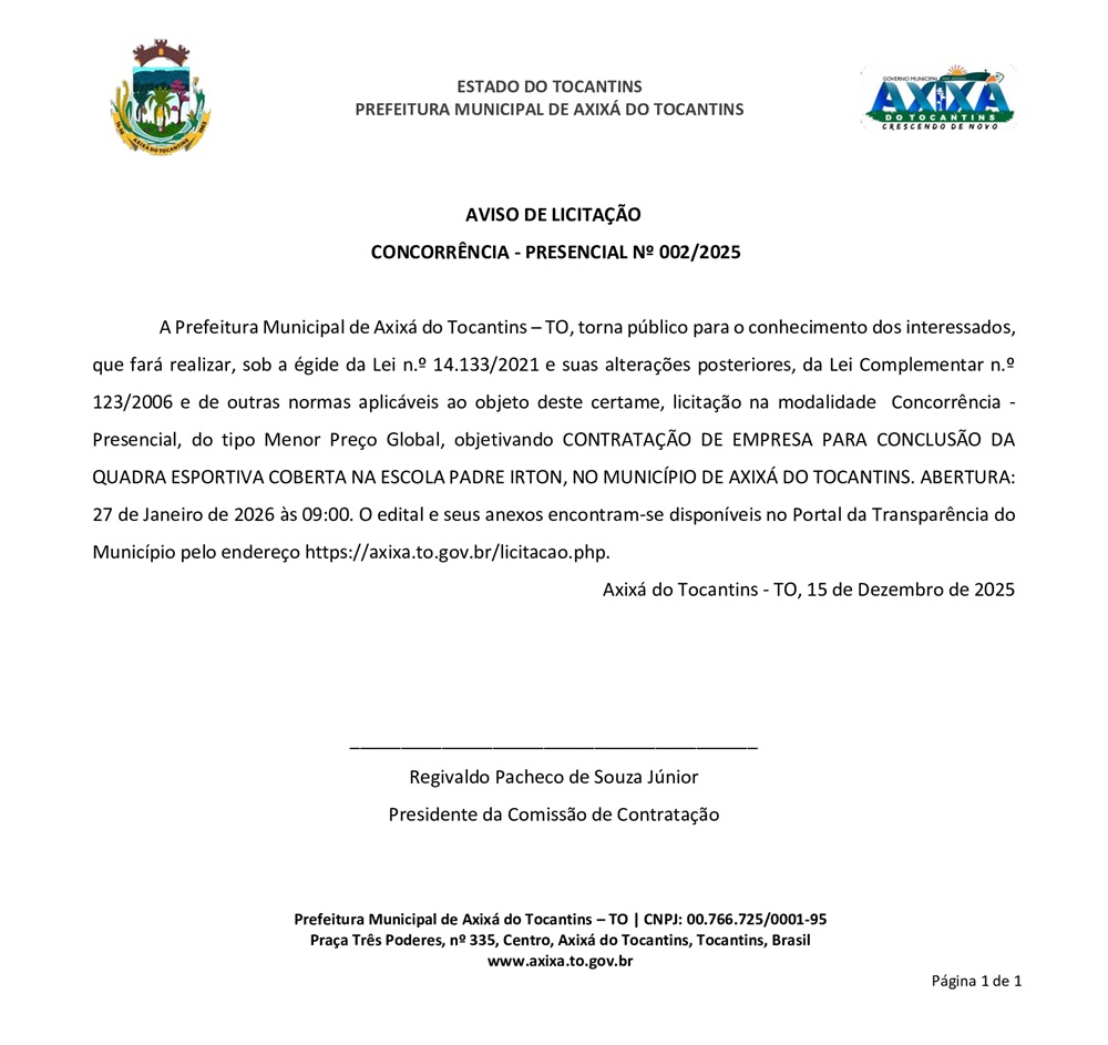 Publicidade Publicidade Geral PREFEITURA DE AXIXÁ DO TO – AVISO DE LICITAÇÃO CONCORRÊNCIA – PRESENCIAL Nº 002/2025 By Folha do Bico 16 de dezembro de 2025 0 112 Share WhatsAppPrintTelegramFacebookTwitterCopy URL Folha do Bico Noticias Relacionadas Processo para tirar carteira de motorista fica mais simples, digital e barato em todo o país 9 de dezembro de 2025 Programa Acredita encerra ciclo 2025 com debates sobre crédito, inovação e gestão inteligente 8 de dezembro de 2025 Recorte Automático de Vídeo para uma Edição Multiformato Sem Esforço 5 de dezembro de 2025 Share WhatsAppPrintTelegramFacebookTwitterCopy URL Previous articleCaminhões envolvidos na obra já fazem travessia na Ponte JKNext articleFAET manifesta apoio à escolha do governo para a Agricultura - Advertisement - - Advertisement - Ultimas noticias Caminhões envolvidos na obra já fazem travessia na Ponte JK 16 de dezembro de 2025 Veículo de passageiros cai no Rio Tocantins ao tentar acessar balsa que liga Aguiarnópolis-TO e Estreio-MA 16 de dezembro de 2025 CURIONÓPOLIS: Cerca de mil pessoas deixam área ocupada após negociação 16 de dezembro de 2025 AÇAILÂNDIA: Adolescente é apreendido por assédio virtual contra professora do Pará 15 de dezembro de 2025