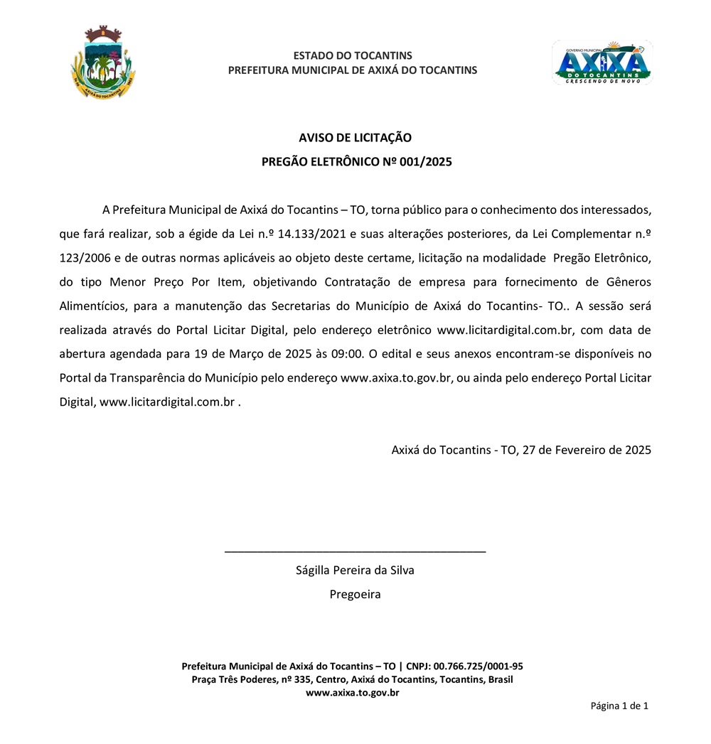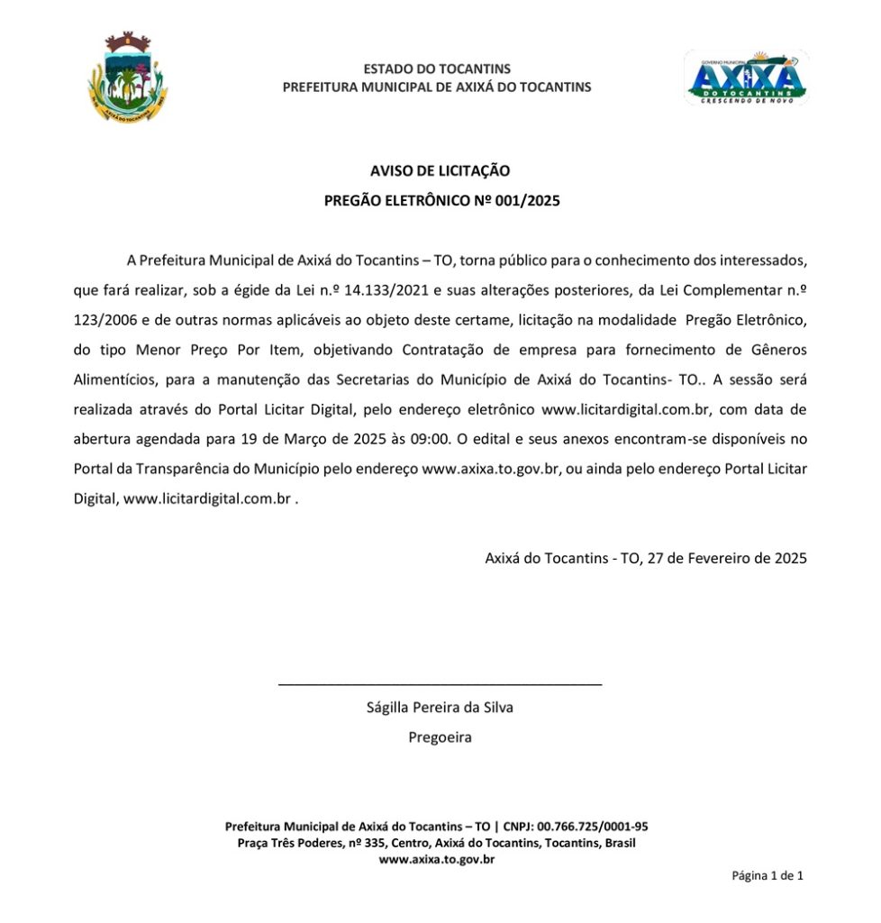 Publicidade Publicidade Geral PREFEITURA DE AXIXÁ DO TO – AVISO DE LICITAÇÃO PREGÃO ELETRÔNICO Nº 001/2025 By Folha do Bico 28 de fevereiro de 2025 0 29 Share WhatsAppPrintTelegramFacebookTwitterCopy URL Folha do Bico Noticias Relacionadas PREFEITURA DE MAURILÂNDIA DO TO – ATO AVISO DE CONCORRÊNCIA ELETRÔNICA Nº 06/2025 – REPUBLICAÇÃO 2 de dezembro de 2025 PREFEITURA DE MAURILÂNDIA DO TO – ATO AVISO DE CONCORRÊNCIA ELETRÔNICA Nº 05/2025 – REPUBLICAÇÃO 2 de dezembro de 2025 PREFEITURA DE MAURILÂNDIA DO TO – ATO AVISO DE CONCORRÊNCIA ELETRÔNICA Nº 04/2025 – REPUBLICAÇÃO 2 de dezembro de 2025 Share WhatsAppPrintTelegramFacebookTwitterCopy URL Previous articleAliado de primeira hora, Júnior Luiz é esquecido pela gestão Eduardo Siqueira CamposNext articlePREFEITURA DE AXIXÁ DO TO – AVISO DE LICITAÇÃO PREGÃO ELETRÔNICO Nº 002/2025 - Advertisement - - Advertisement - Ultimas noticias AUGUSTINÓPOLIS: Vigilante de abrigo é preso suspeito de abusar duas crianças 4 de dezembro de 2025 SÃO MIGUEL: Lixão é fechado e passa a ter acesso controlado sob novas diretrizes ambientais 4 de dezembro de 2025 ARAGUATINS: Insatisfeitos, Abmael, Chico Moura e Rafael Oliveira passam a votar com a oposição e complicam gestão Aquiles 4 de dezembro de 2025 ARAGUATINS: Com voto decisivo e comando da oposição, Airton se torna principal contraponto à gestão Aquiles 4 de dezembro de 2025